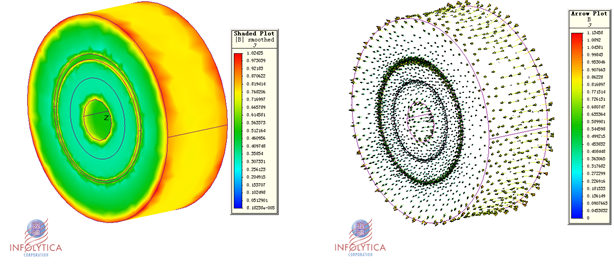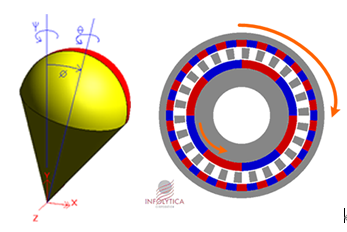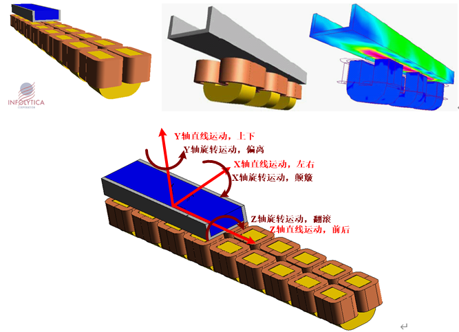INFOLYTICA的2D/3D多运动部件多自由度瞬态运动求解器是市场上唯一支持六自由度的电磁求解器,即可以求解沿X轴、Y轴、Z轴的旋转和沿X轴、Y轴、Z轴的直线运动,实现三维空间的任意运动动态仿真。可以求解磁悬浮电机、球形电机、多转子电机等。