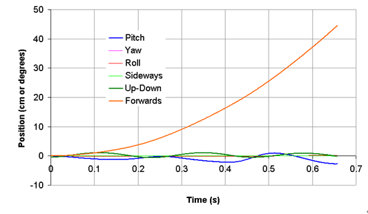 本图显示列车六个自由度随时间的位置曲线。可以看出列车沿轨道方向稳定加速。颠簸和前后运动特征比较显著。产生这样的结果有一部分原因是在初始状态,但最主要的原因是众所周知的关于这类磁悬浮列车的一种叫做“dolphin effect”的现象,事实上,即使振荡逐渐消失,列车也不会一直沿着轨道运行,它也将根据速度不断颠簸。