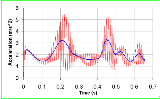 本图显示的是列车的加速度,红色曲线代表的是瞬时加速度,而蓝色则是该时段内的平均加速度。加速度不断变化的原因有:列车离轨道的距离,列车与电极的相对位置和电流的相位。最后模拟结果显示列车的速度达到1.34 m/s,是同步速度27 m/s 的5%。