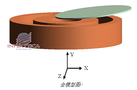 本模型为一个3毫米厚的铝板位于两个相位差为180度的线圈之上。铝板开始时不在线圈的中心,它的运动可以用三个自由度来仿真:沿X轴, Y轴的直线运动和沿Z轴的旋转运动。