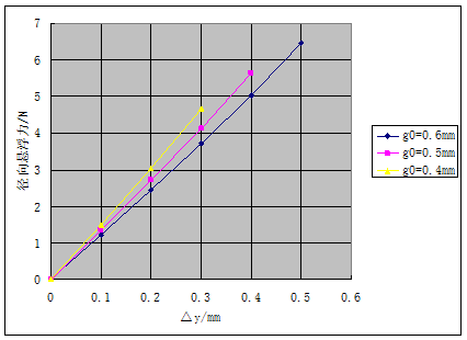 由上图可以看出:1)径向磁浮力与内环径向偏移量成正比,偏移量越大,径向磁浮力越大,在无偏心时,径向力为零。2)径向磁浮力与平均气隙有关,同一内环偏心量下平均气隙越小径向磁浮力越大。