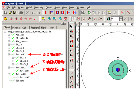 Motion#1设定为绕Z轴的旋转运动,速度驱动方式,匀速度为500rpm;Motion#2设定为沿X轴的直线运动,负载驱动方式,初速度为0,初始位置内磁环沿X负方向偏心0.1mm,这样在X方向上会产生沿X轴正方向的推力;Motion#3设定为沿Y轴的直线运动,负载驱动方式,初速度为0,初始位置内磁环沿Y负方向不偏心,Y方向设定重力加速度为9.8 m/s^2。
