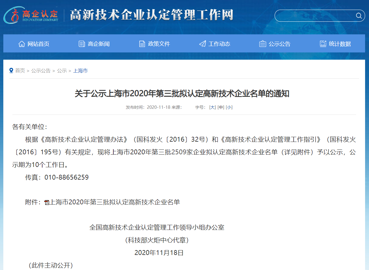 根据科技部、财政部、国家税务总局《高新技术企业认定管理办法》(国科发火〔2016〕32号)、《高新技术企业认定管理工作指引》(国科发火〔2016〕195号)、《上海市高新技术企业认定管理实施办法》(沪科合〔2016〕22号)的有关规定,经审查,现将2020年度符合高新技术企业认定条件的第三批拟认定高新技术企业名单(见附件)予以公示。上海引之信息科技有限公司凭借先进的科研技术和创新能力,荣登榜单。
